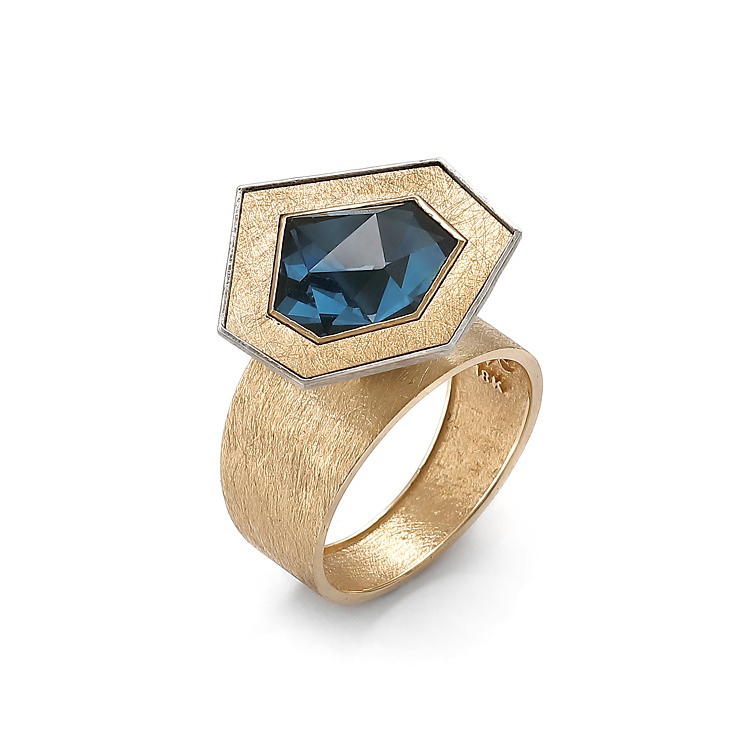 Pierścionek wykonany ze złota próby 750/ 18k oraz srebra z centralnie osadzonym topazem w szlifie „twenty first century”